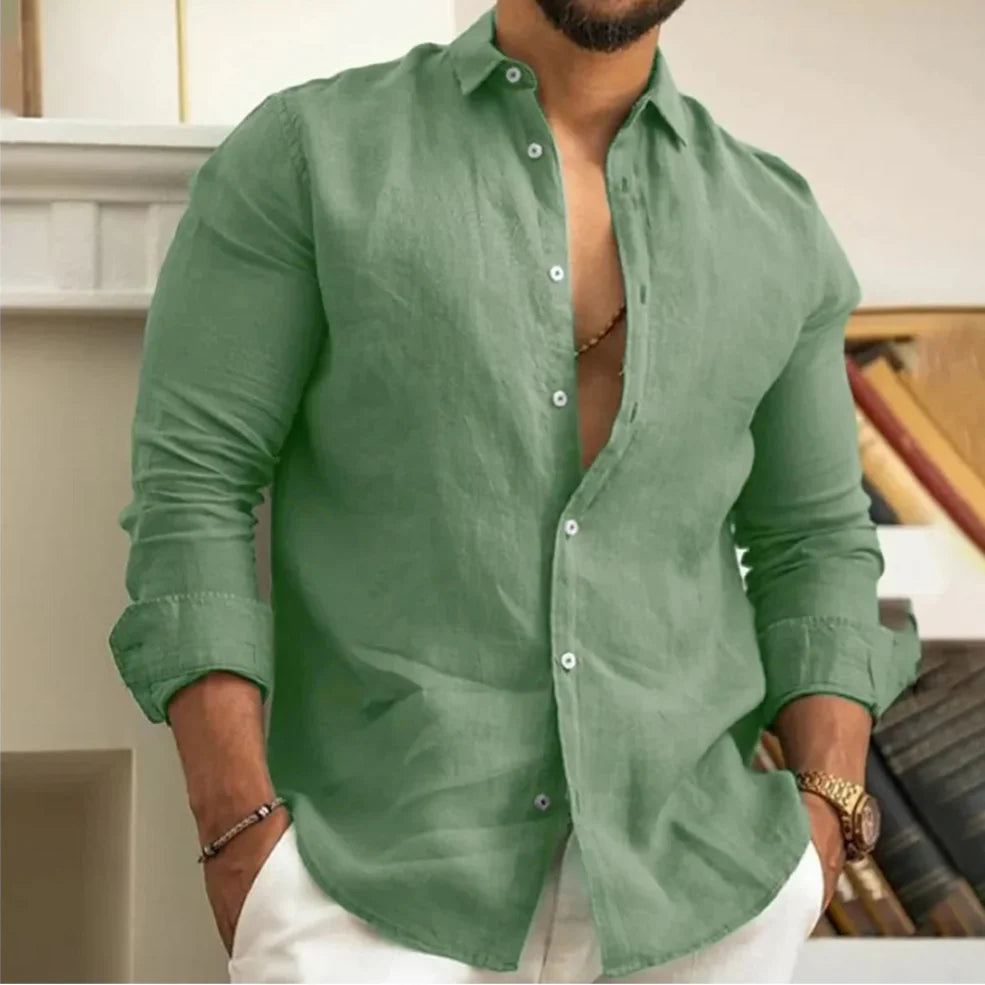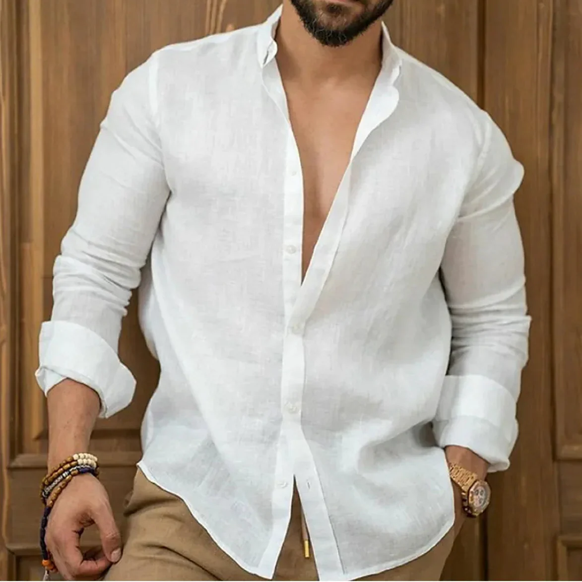 Dieses Herrenhemd hat eine durchgehende Knopfleiste auf der Vorderseite. Es verfügt über einen Hemdkragen. Die Ärmel sind lang. Der Saum ist abgerundet.